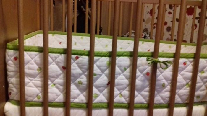 Ochranný pás na postýlku Ikea, bílozelený, zachovalý. Uvazuje se po celé délce postýlky šňůrkami. Světle zelený. Šířka 35 cm, délka 120 cm.